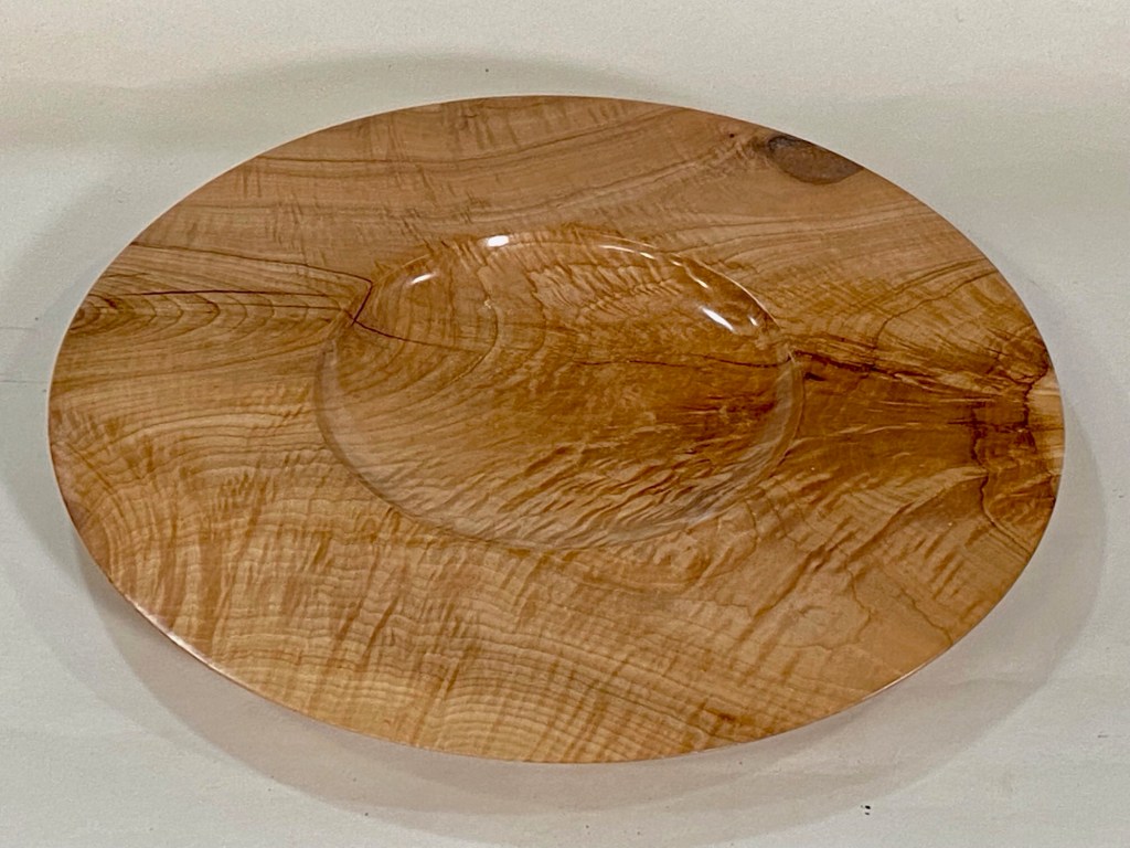 Norway Maple Crotch-figure Artistic Shallow Bowl #4094. Dimensions: 14 1/2’’W x 1 1/4’’H. Tree log from Lennox Ave. Toronto. Price: $550.