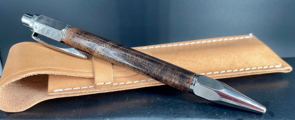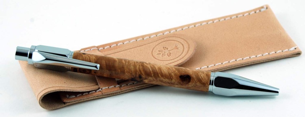 Facet-Grip Click Ballpoint Pen in chrome finish. Maple burl wood. Price: $135. Leather pouch made in Ontario, Price: $35.