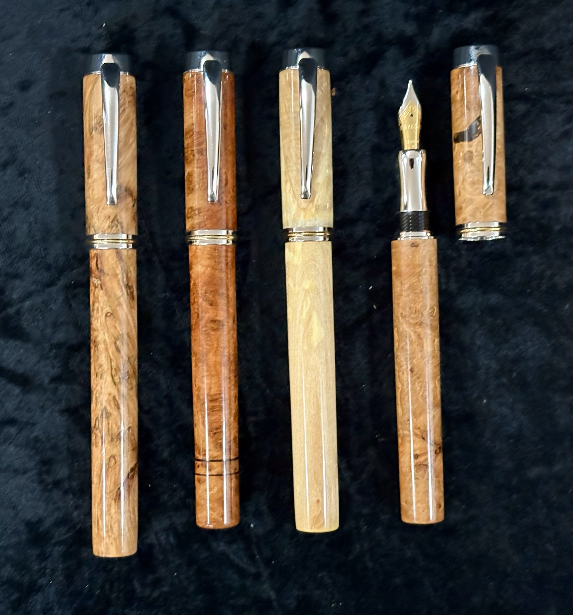 EcoWoodturner Gentlemen’s Closed-end Fountain Pen – Limited Edition. This is a larger, heftier pen. Size is approx. 6.125”L x 0.6875”W. Red Maple Burl wood, Cherry Burl wood, Silver Maple Burl wood, Big Leaf Maple Burl wood. 22K gold/cobalt accents, iridium point M or B German nib, with maple pen box.