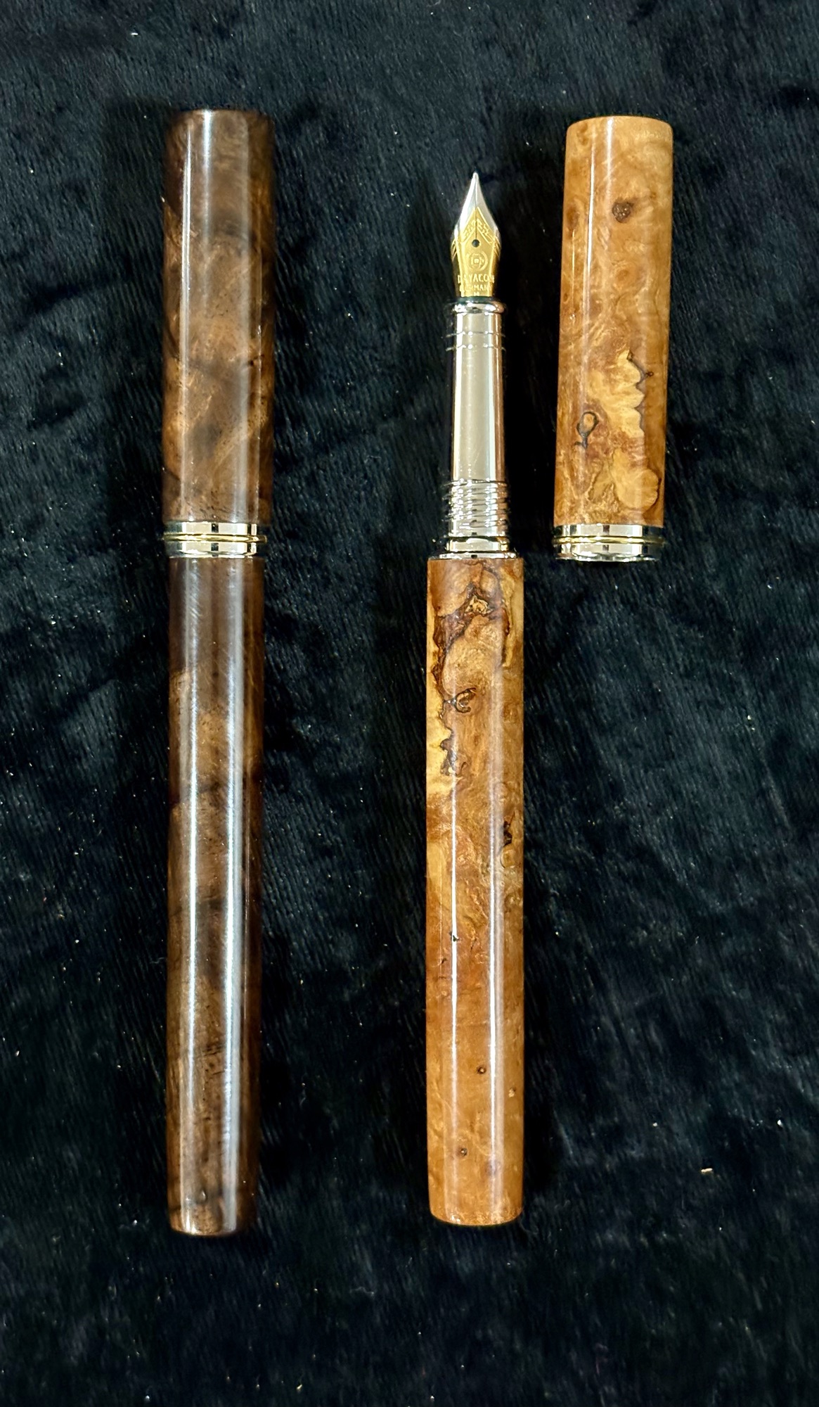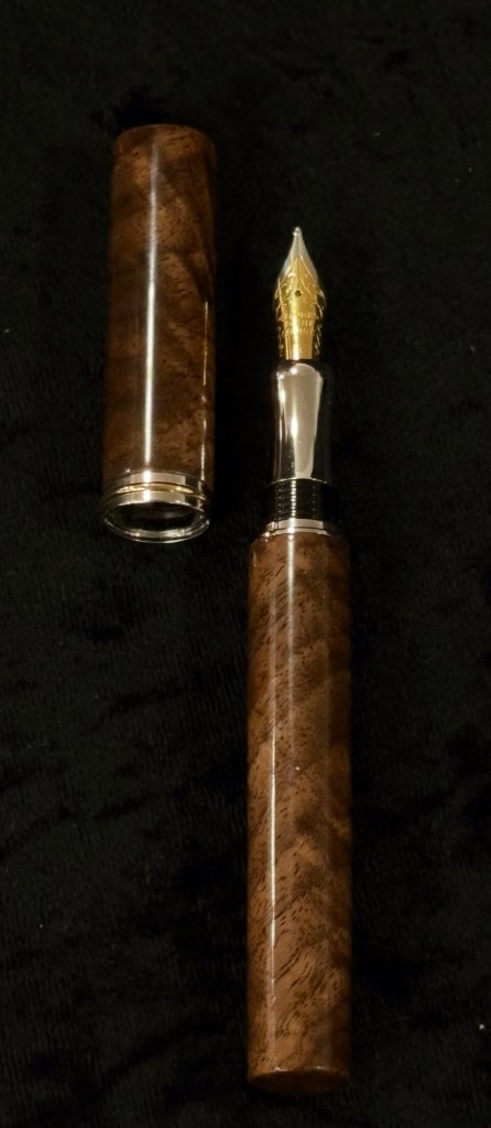 Beautiful walnut- crotch figure, one-of-a-kind wood. 22K gold/cobalt accents, iridium point “M” German nib, with maple pen box.