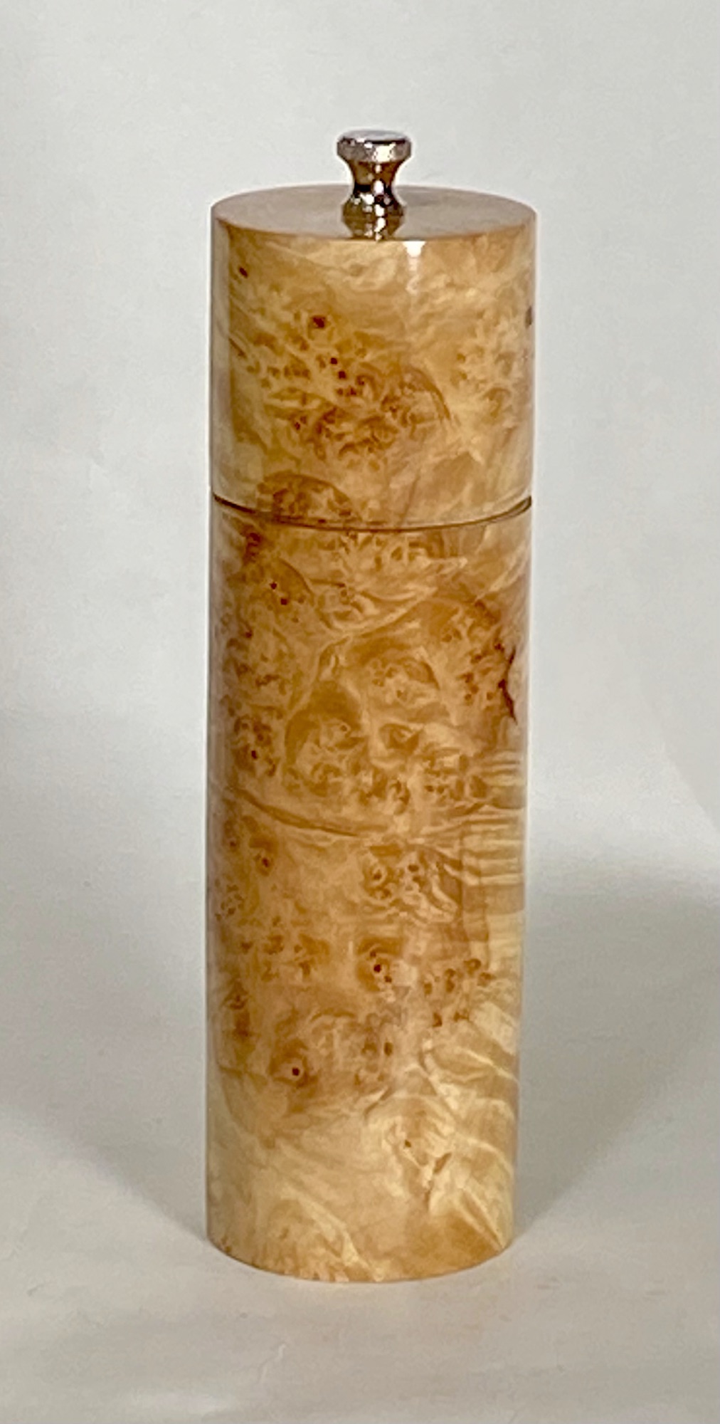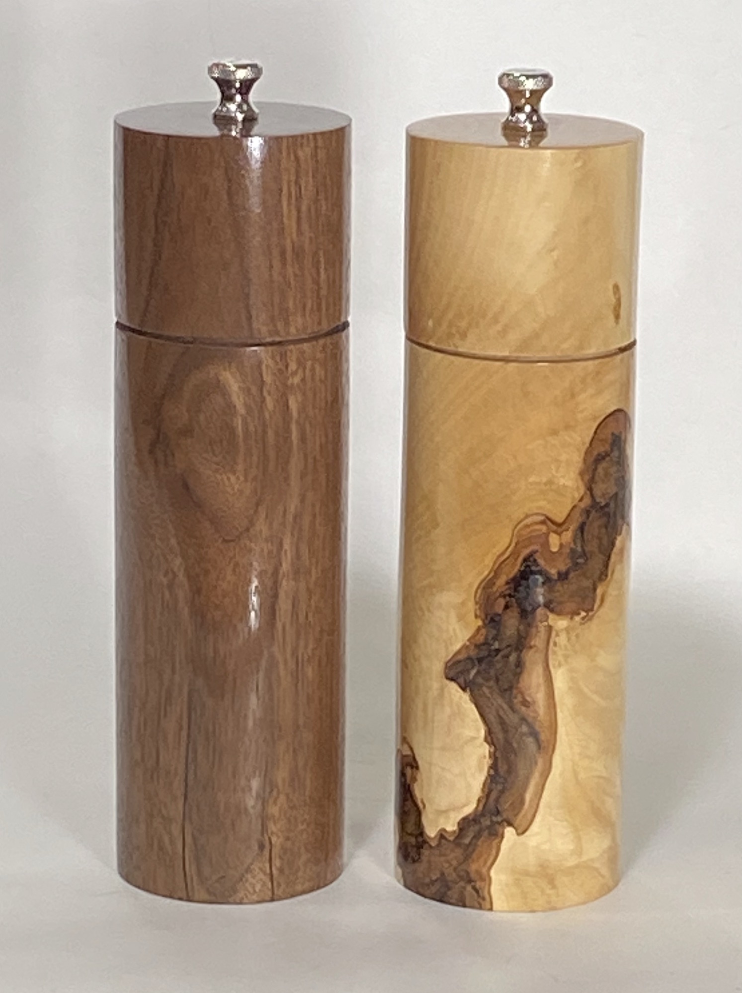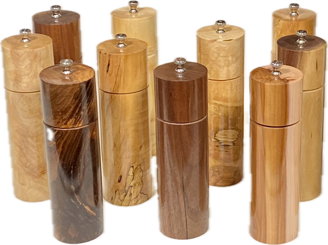 EcoWoodturner 8 inch tall salt & pepper mills are solid to hold and beautiful on your table. The grinding mechanism is stainless steel. A ceramic grinding mechanism is optional for salt mills when used in a high-humidity environment.
