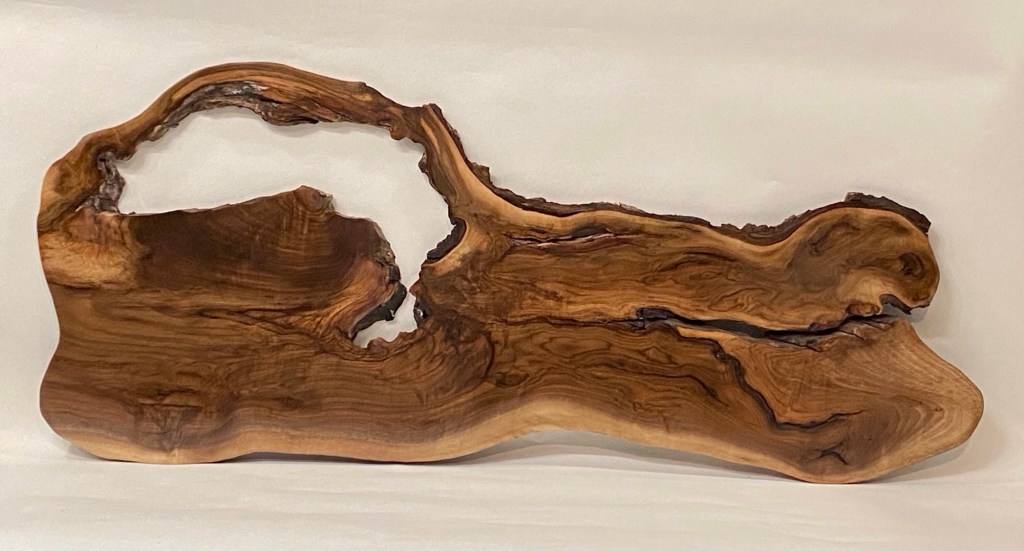 Walnut Artistic Board #568. Beautiful grain with natural voids & flowing movement. Dimensions: 43’’L x 18”W. Tree log from Toronto. Price: $775.